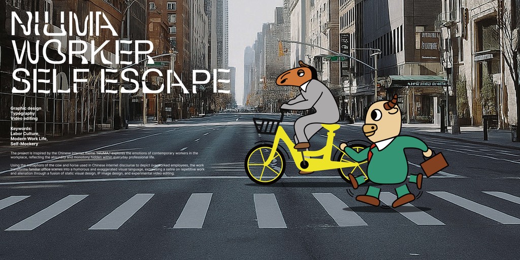 Using the metaphors of the cow and horse used in Chinese internet discourse to depict overworked employees, the work transforms familiar office scenes into a humorous and exaggerated visual language, expressing a satire on repetitive work and alienation through a fusion of static visual design, IP image design, and experimental video editing.